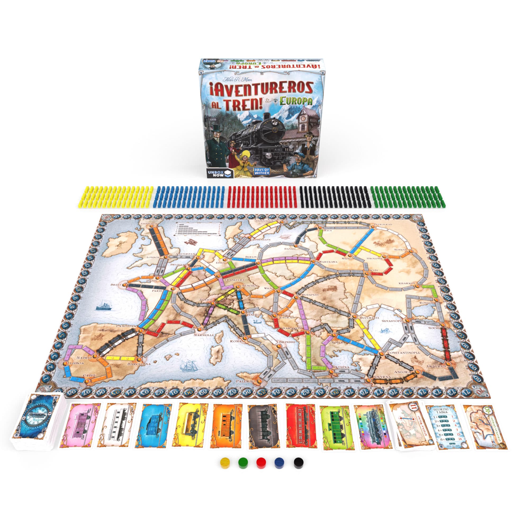 ¡Aventureros al tren! es un juego de aventuras en tren en el que los jugadores cubren recorridos conectando ciudades por toda Europa. ¡Cumple tus objetivos y no pierdas de vista los recorridos de tus oponentes! ¡Pasajeros al tren!